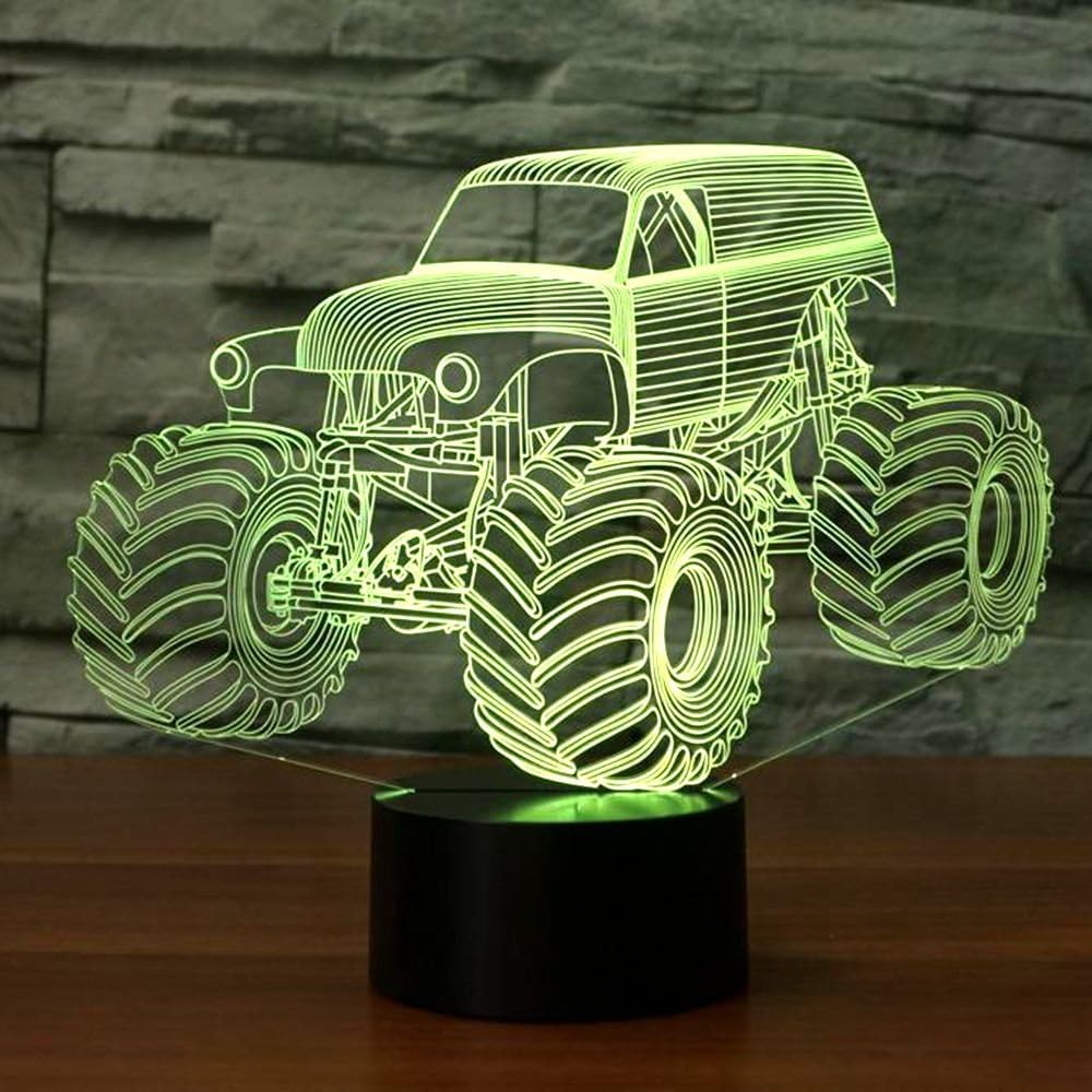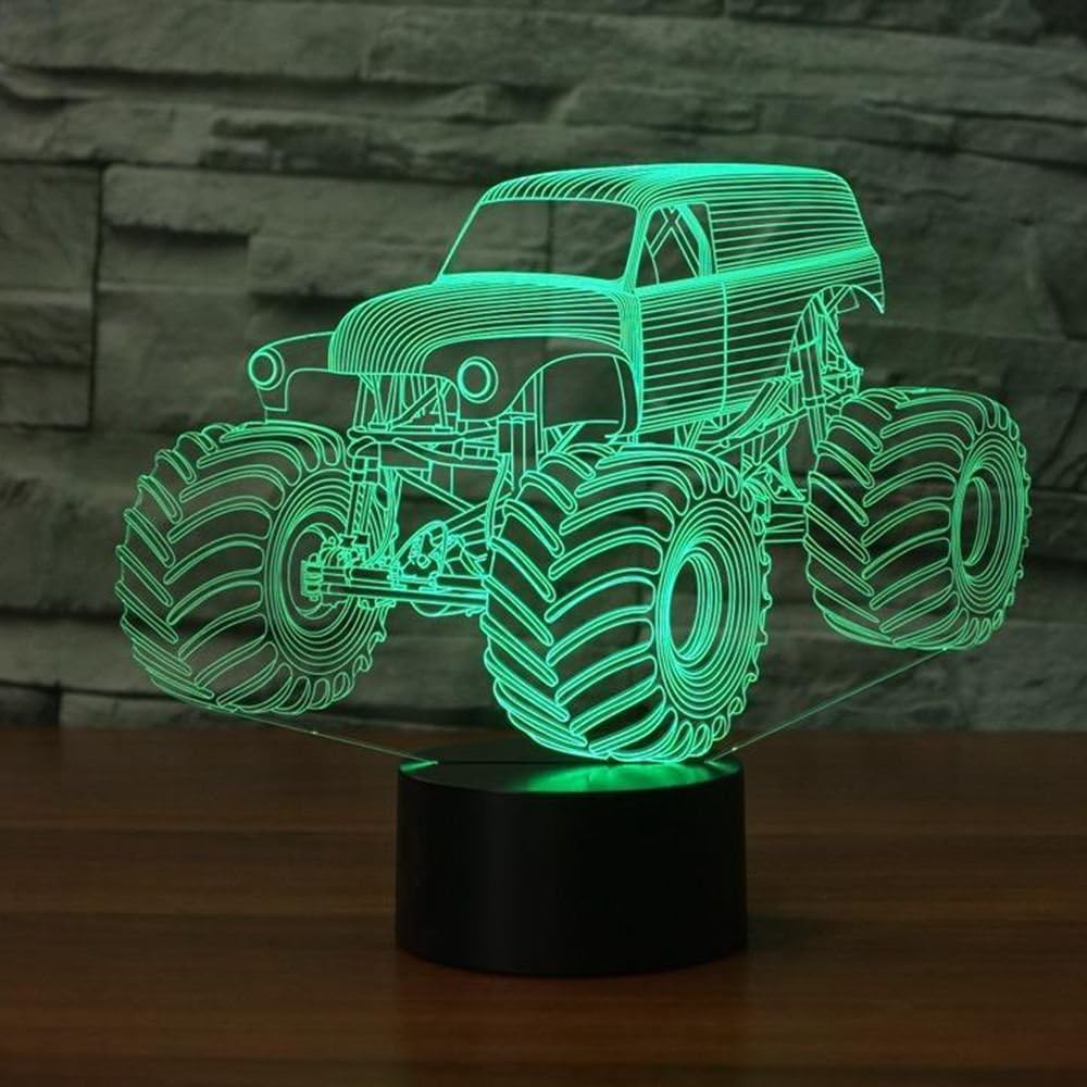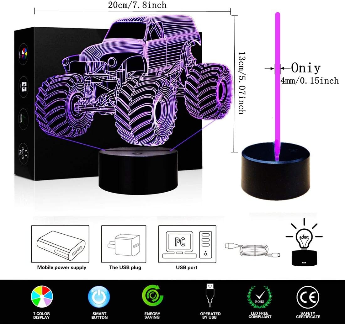 3D Illusion LED Lamp Night Light for Kids Monster Truck 7 Colors Touch Switch Table Desk Lamp, for Home Office Children Room Theme Monster Trucks Decorat and Kids Children Family Holiday Gift