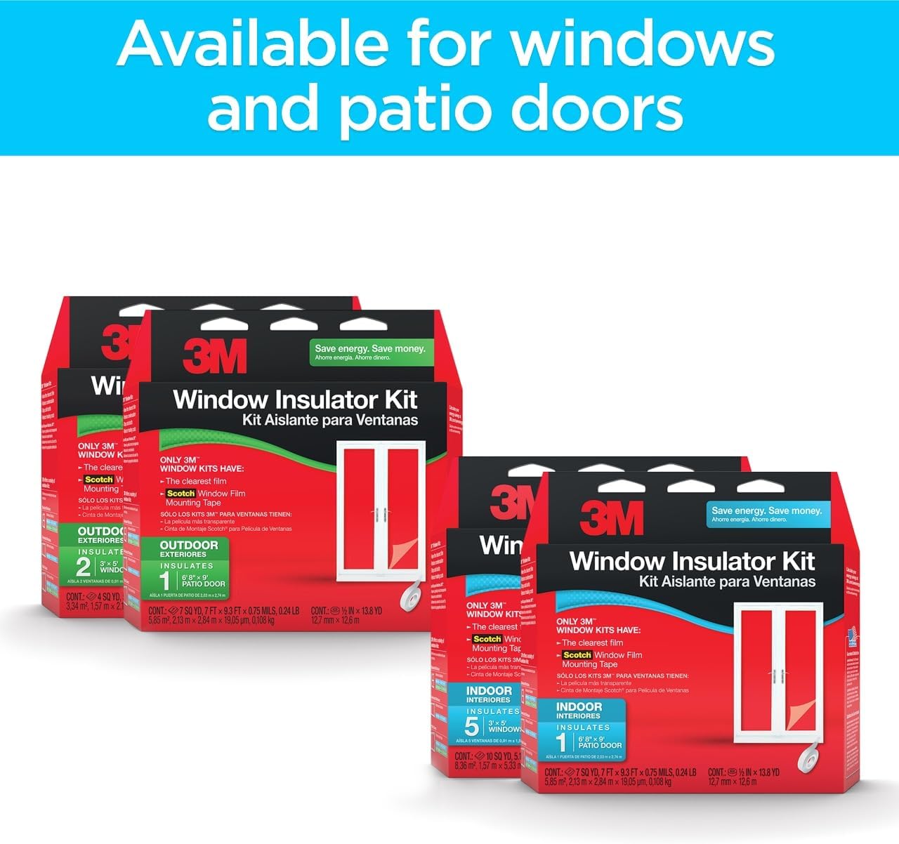 Available in a variety of indoor and outdoor window sizes. 3M Window Insulator Kits keep cold drafts out and warm air in through heat shrink window film and Scotch Window Film Mounting Tape. 3M window kits have the clearest film and stay up all season long with Scotch tape technology. Scotch double sided tape holds firmly between films and surfaces.