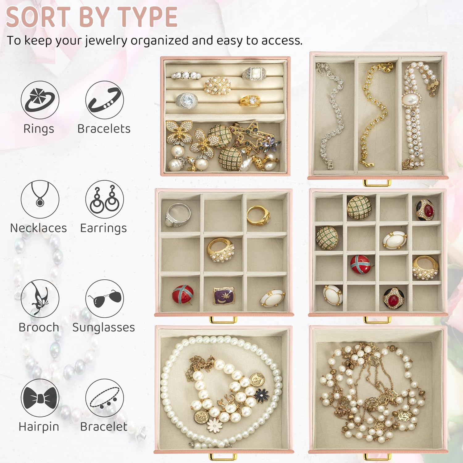 LARGE CAPACITY, With 6 versatile pull out drawers, this jewelry box can store a lot of jewelry accessories, such as rings, earrings, necklaces, chains, bracelets, and so on. Soft pillows in the bottom drawer suit for storing watches. One deeper drawer is designed for sunglasses or large jewelries