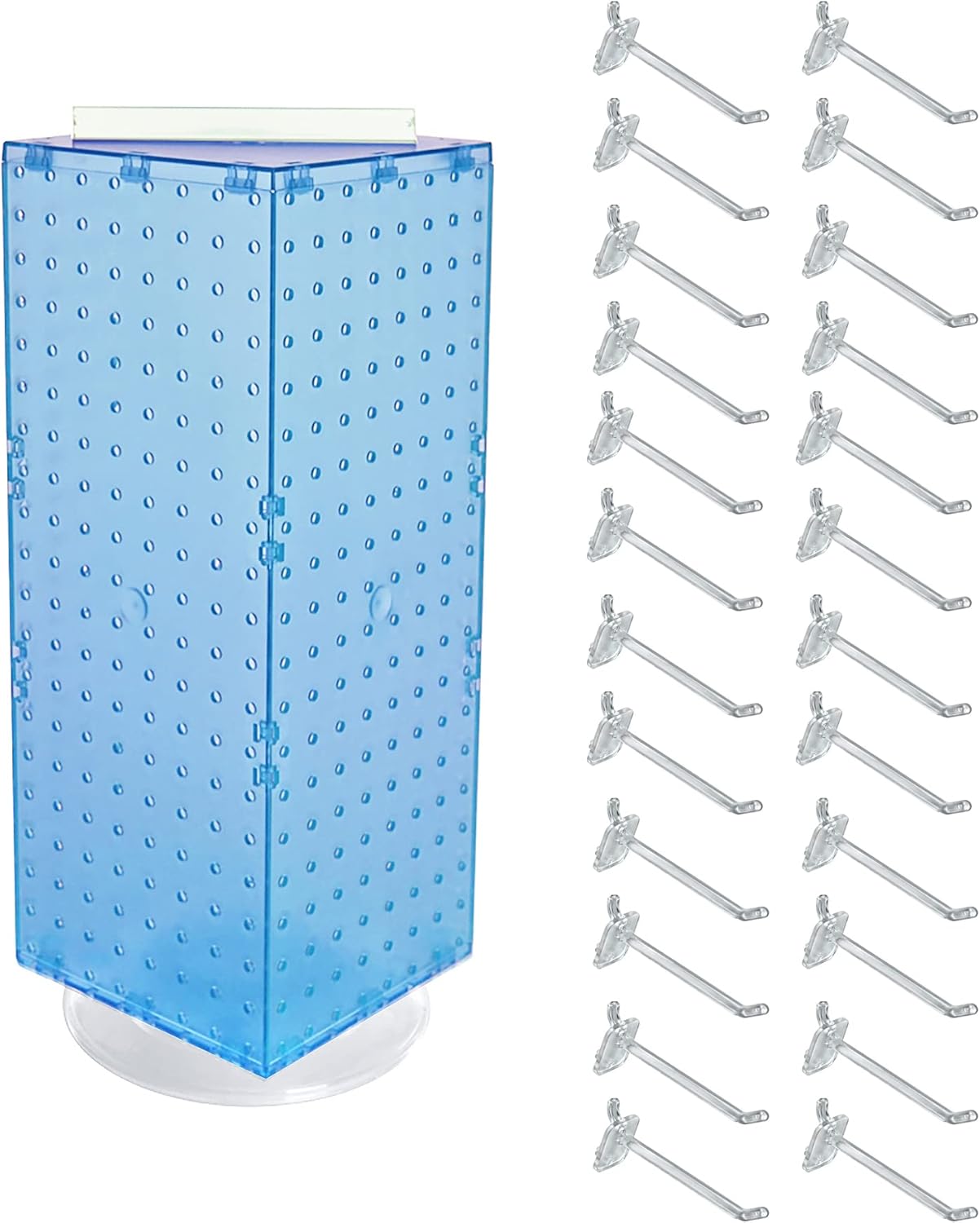Azar Displays Four-Sided 8”W x 20”H Counter Pegboard Tower with Revolving 9” Base and 24 Hooks. The display includes 24 hooks that are 4” in length and made of durable Polycarbonate plastic. The locking peg hooks “snap” into the pegboard and do not move or wobble. Easily remove the hook by pulling up and releasing the bottom peg. Attach the included T-Strip Sign Holder on top, add your own sign or branding and start selling! Impulse buys at the cash wrap are key to boosting and maximizing sales. Presentation of your product on a great display, ease of shopping, and visual appeal all contribute to your bottom line. Increase your sales using Azar Displays versatile counter turntable racks! This four-sided spinning counter pegboard display sits on a revolving plastic base. Catch your customers attention by featuring products at the customers eye level. The spinner display arrives assembled, you only need to add the hooks and sign holder T-strip on top. The 4-sided counter swivel pegboard display is ideal to sit on any counter or table top in department and convenience stores (c-stores), trade show booths, or any retail environment. Our rotating tabletop display racks for retail merchandising are easy to clean and maintain. They are strong, highly durable and take up minimal space on your counter. Available in many pegboard colors. The Solid white pegboard comes with a white base and white hooks, and the solid black pegboard comes with a black base and black hooks. All other translucent colors come with a clear base and clear hooks.