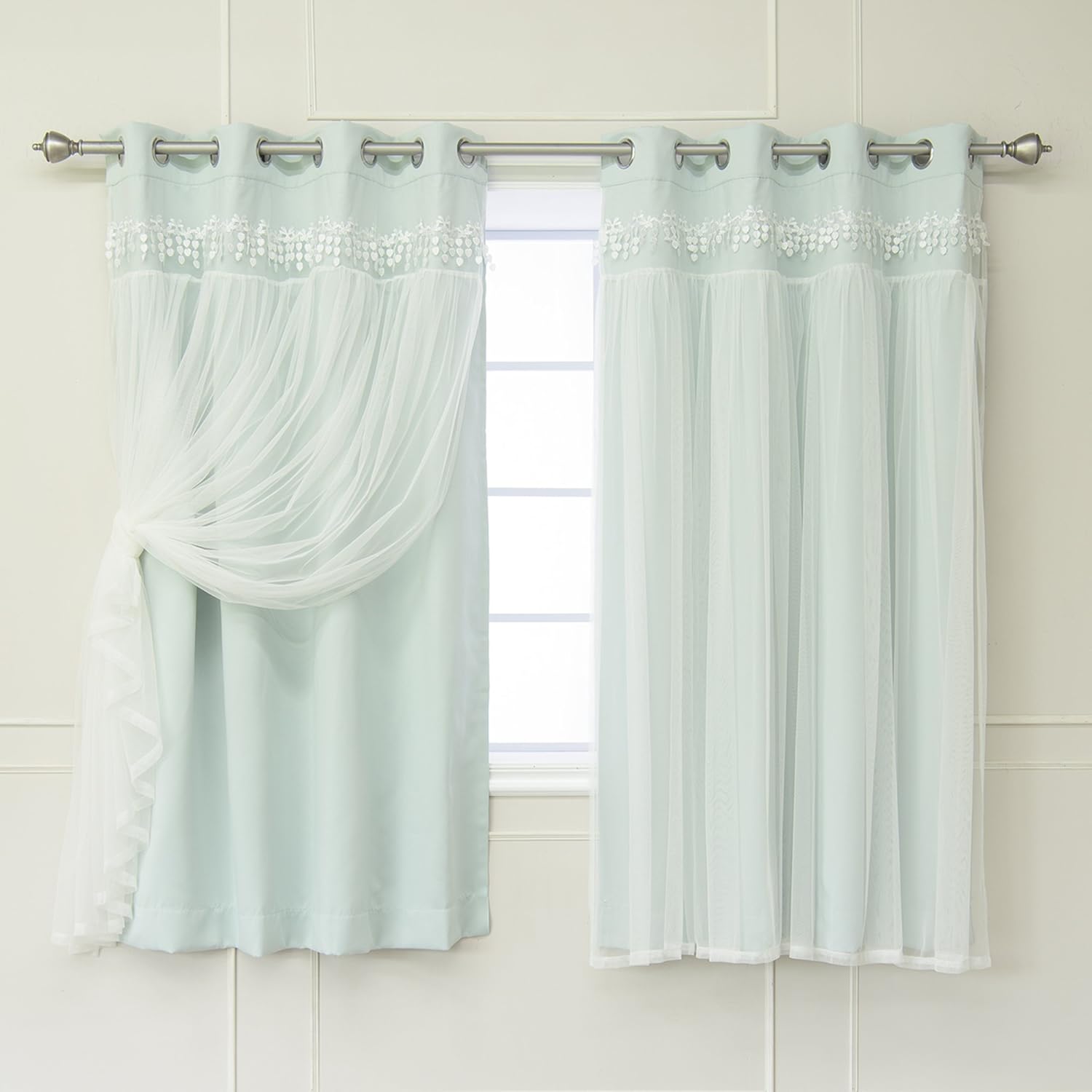 Elegant and sophisticated lace overlay blackout curtains are a luxurious complement to your existing home decor. The delicate and romantic Tulle gracefully drapes your windows, while the underlying panel provides reliable light control, insulation and much desired privacy.
