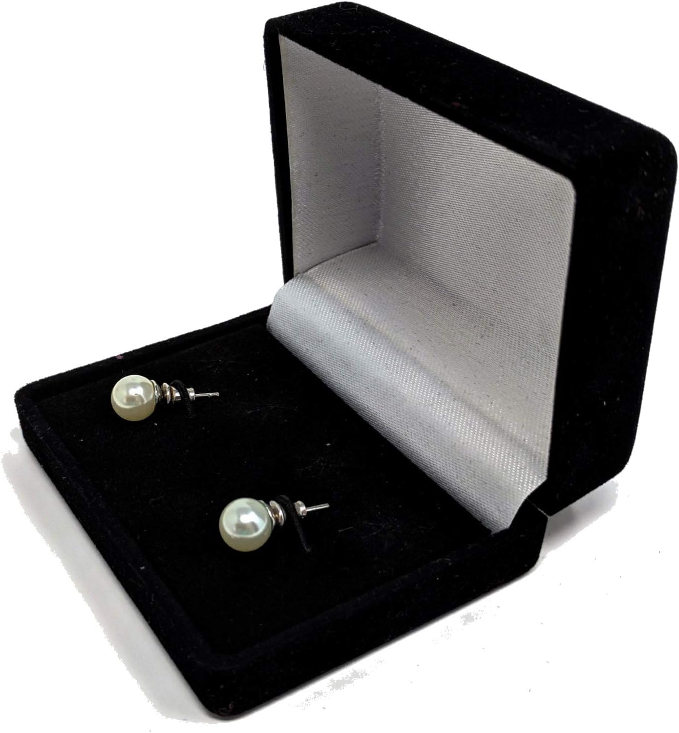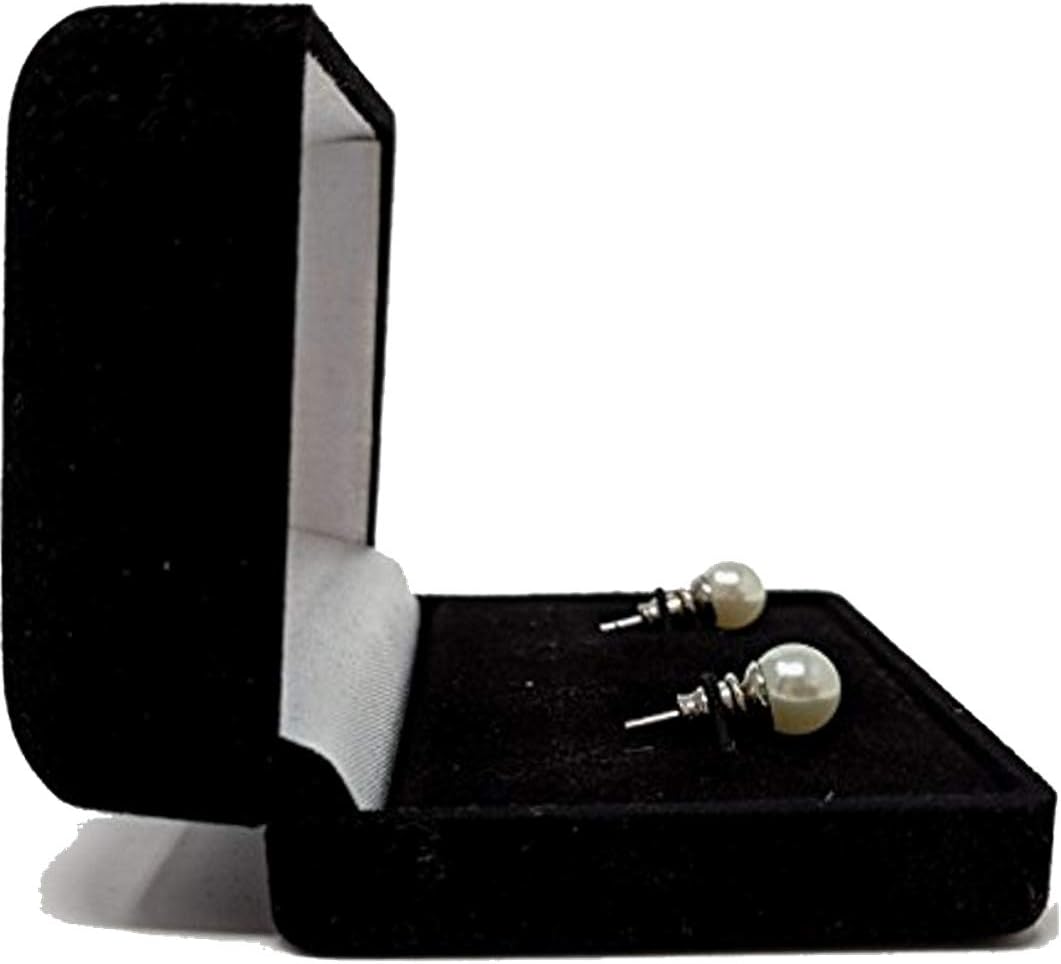Velvet The perfect jewelry box to hold a pair of earrings side by side, 2 pendants, or two other accent pieces of yours. Right size for your small or medium jewelry. The box is 3″ wide X 2.375″ long * 1.375″ high, when sealed (roughly 8 CM * 6 CM * 3.5 CM). When opened, it extends to 2.75″ High. Delicately soft velvet exterior lends a luxurious look to your pieces. Inside, your jewelry will rest on the same beautiful soft black velvet backdrop, a hard white / cream / ivory interior showcases your pieces. Looking for a beautiful box for your Christmas present or anniversary earrings, necklace, pendants, or cufflinks? This is it! While this does fit earrings, we’re sorry but no jewelry is included. You’ll have to supply your own gorgeous pieces to fill this exquisite box!