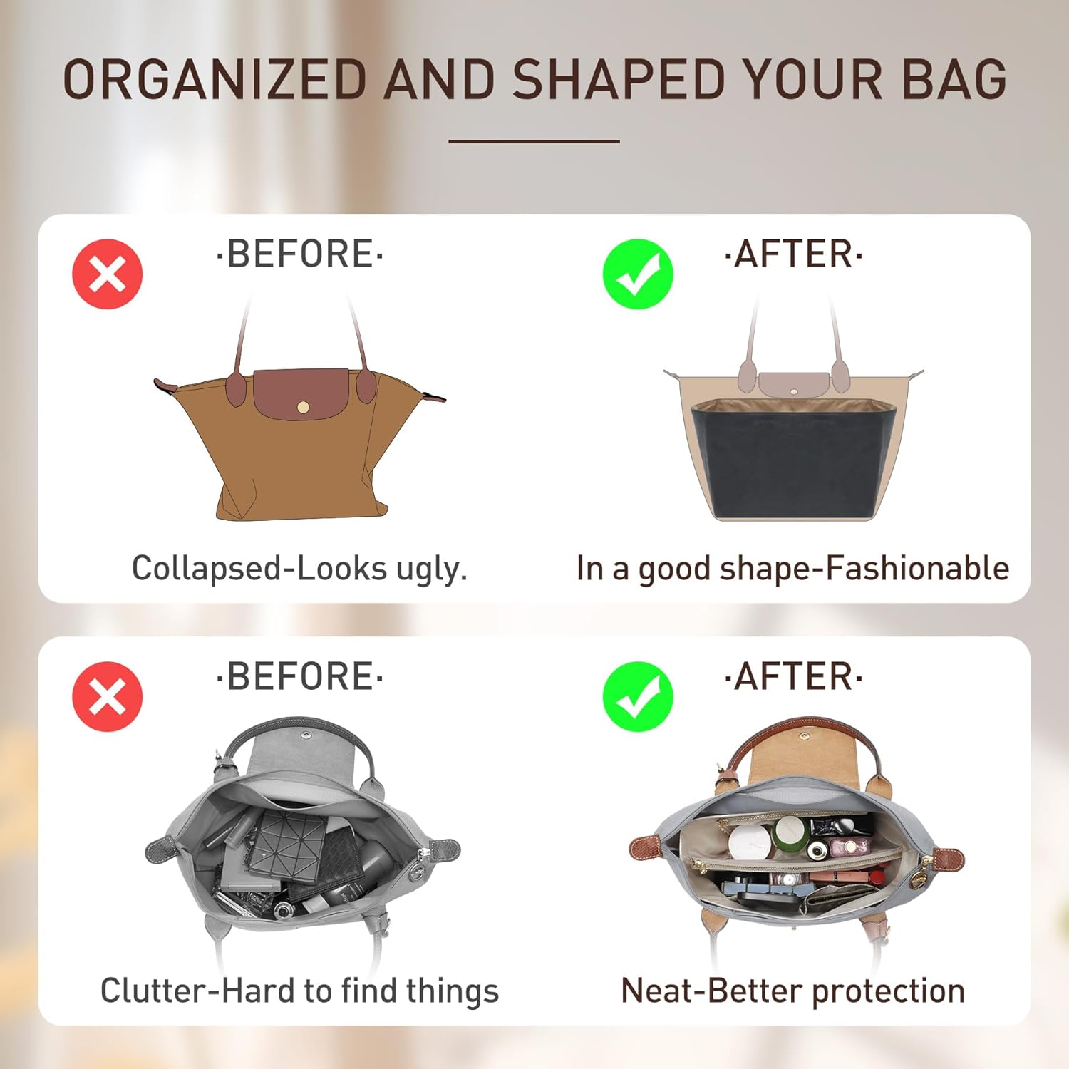 Our Upgraded longcham bag insert is washable which is easy to clean. No more worrying about getting your bag dirty.
