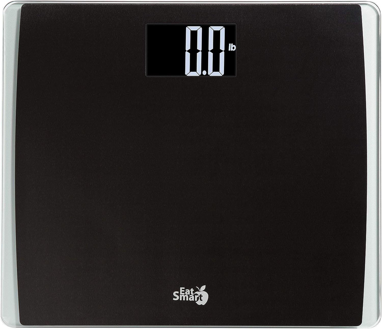 The Eat Smart Precision 550 tops the charts with its extra high 550 lb. capacity, the highest capacity in the market. The generous 15” x 13” platform is highlighted by black stainless steel placed on a silver glass base, easily accommodates all foot sizes, provides comfort and stability, and is sturdily constructed. Four precision sensors and proprietary step-on technology ensure instant and accurate measurements in 0.2 lb. or 0.1 kg increments, eliminating the need to tap on the scale and wait for it to calibrate before stepping on. Once your weight has been taken, the scale will beep three times and hold your reading on the 3″ x 2.25″ bold black with bright white digits display, allowing extra time for you to step off the scale and view your weight. After several seconds, the scale’s auto off feature will activate to power off the scale and conserve battery power. Backed by the EatSmart 100. Please contact us for help or troubleshooting your scale.