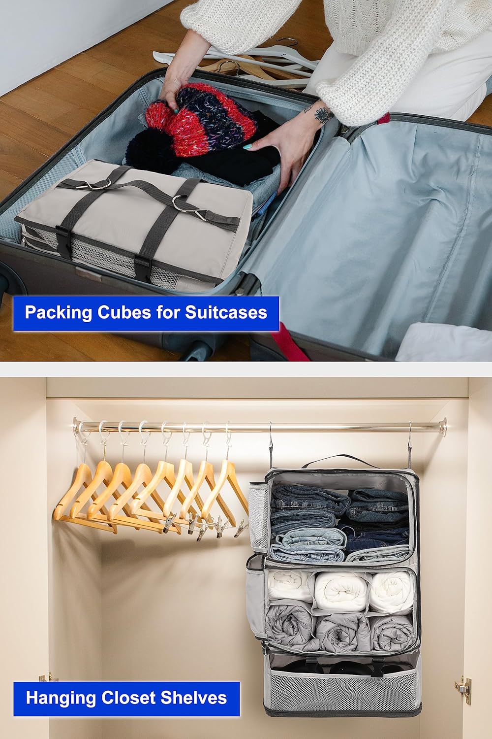 [Multiple Applications] – This hanging shelf can be an all-purpose organizing tool, it can not only fit the suitcase but could also be effectively used at home/ dorm/ hotel/ hospital and van/camper to enhance your closet organization, providing the ultimate convenience for your business trips or vacation.