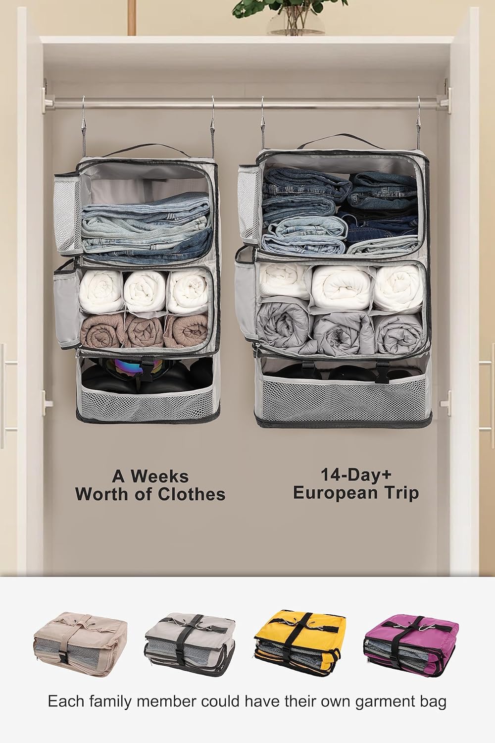 [Stay Organized] – Portable Hanging Shelf (No Side Pockets) allows you to pack and unpack effortlessly, making your trip less tumultuous and more enjoyable. With different colors for family vacations, everyone could own a travel garment bag. If you are planning a summer holiday, size#Large could be suitable for a week’s worth of clothes and #X-Large ones may be ideal for longer trips. One luggage organizer bag is all you need to meet your multiple packing needs.