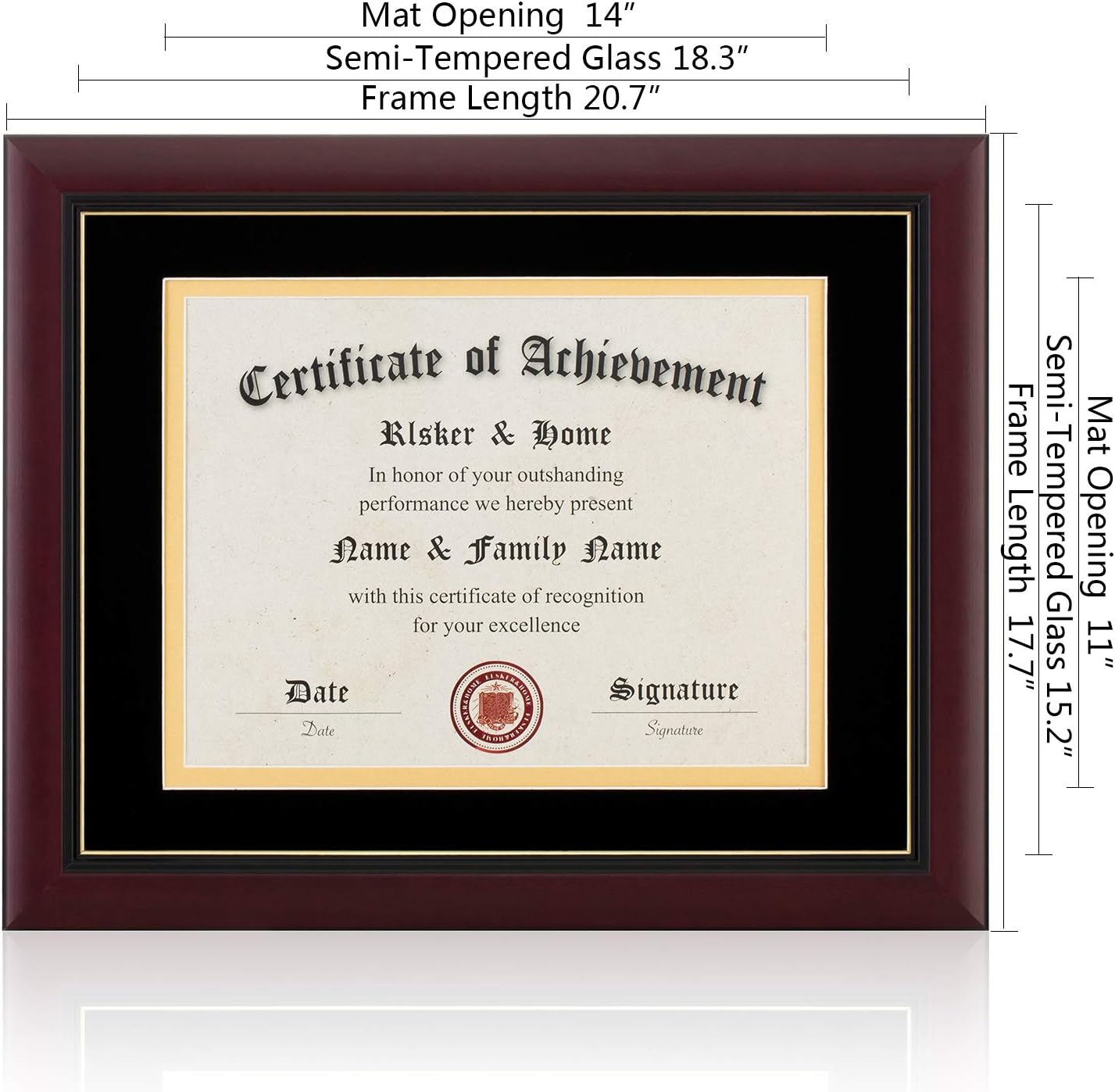 Size: This frame only fits a document that is 11×14. Please measure your diploma or document before placing your order,Make sure it matches the inside dimensions of the product we sell. The outside dimensions of this diploma frame is approximately 18.2×15.2.