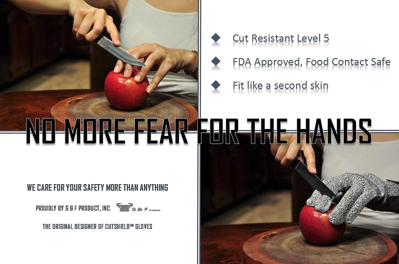 G & F CUTShield Slash Resistant Series is using the latest exclusive CUTSHIELD fiber blend technology. High Level Cut rating certified by CE EN388 Testing Standard. Machine Washable, but do not iron. Size: M-XL