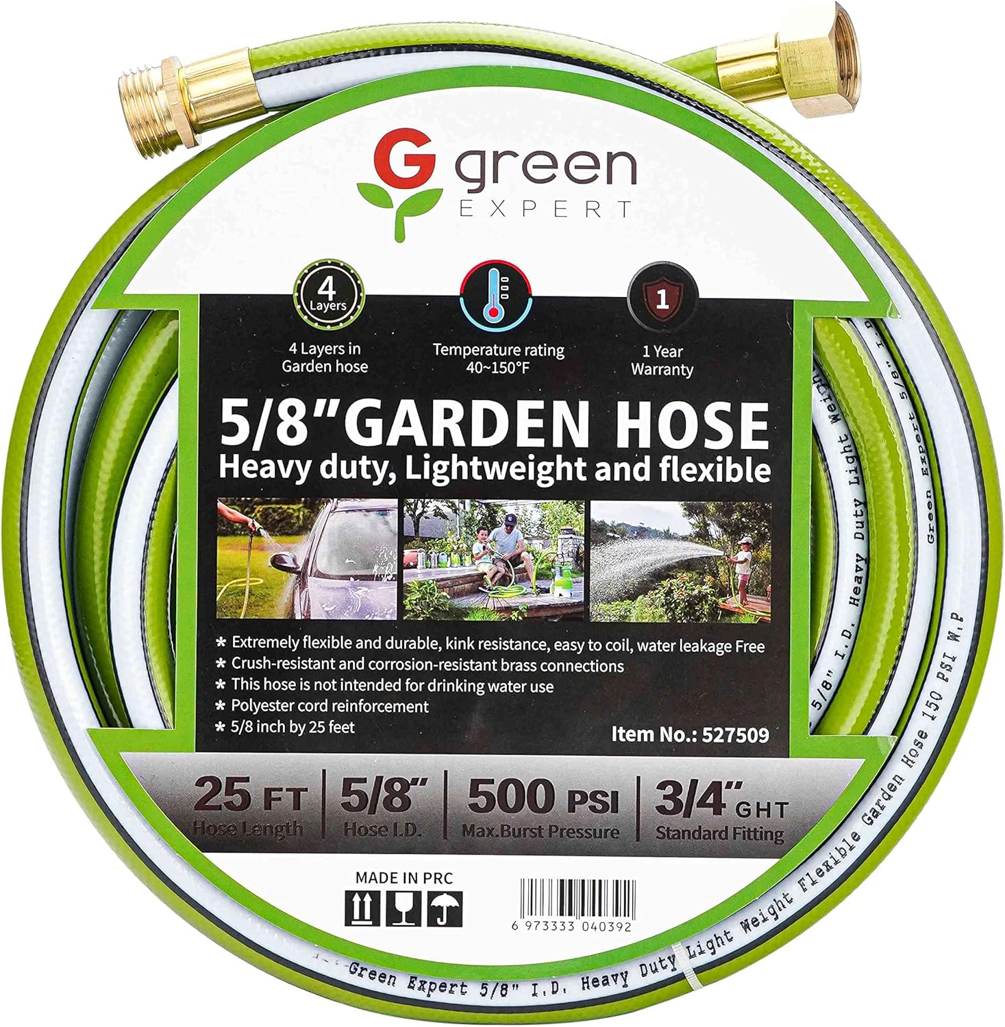 Green Expert PVC Garden Hose 5/8″ ID with 3/4″ GHT Brass Fittings for Easy Installation No-Pressure-Lose Hose Quick Water Transferring in House Garden Backyard Farm 25FT 527509