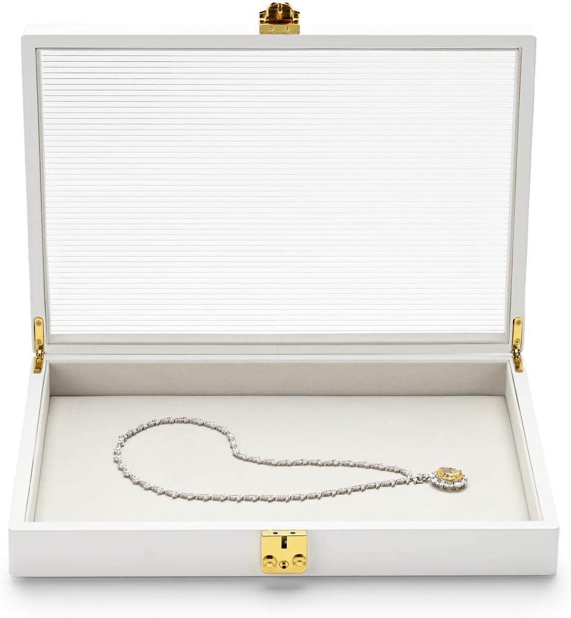 Jewelry Display Case with Clear Acrylic Lid – White PU Leather Earring & Ring Organizer Tray with Metal Clasp – Stackable Storage Box for Necklaces, Bracelets (13.8 x 9.4 Inches)