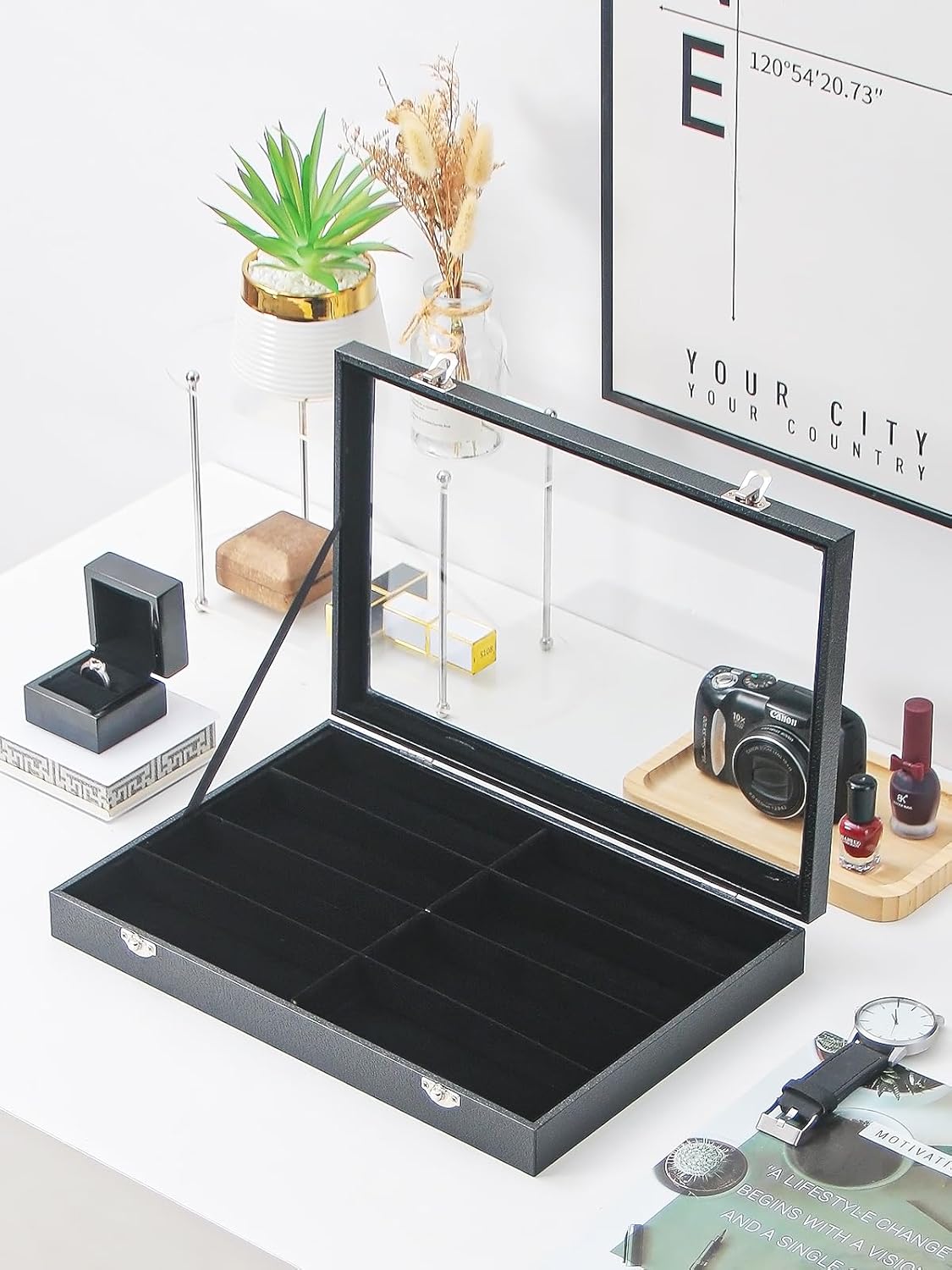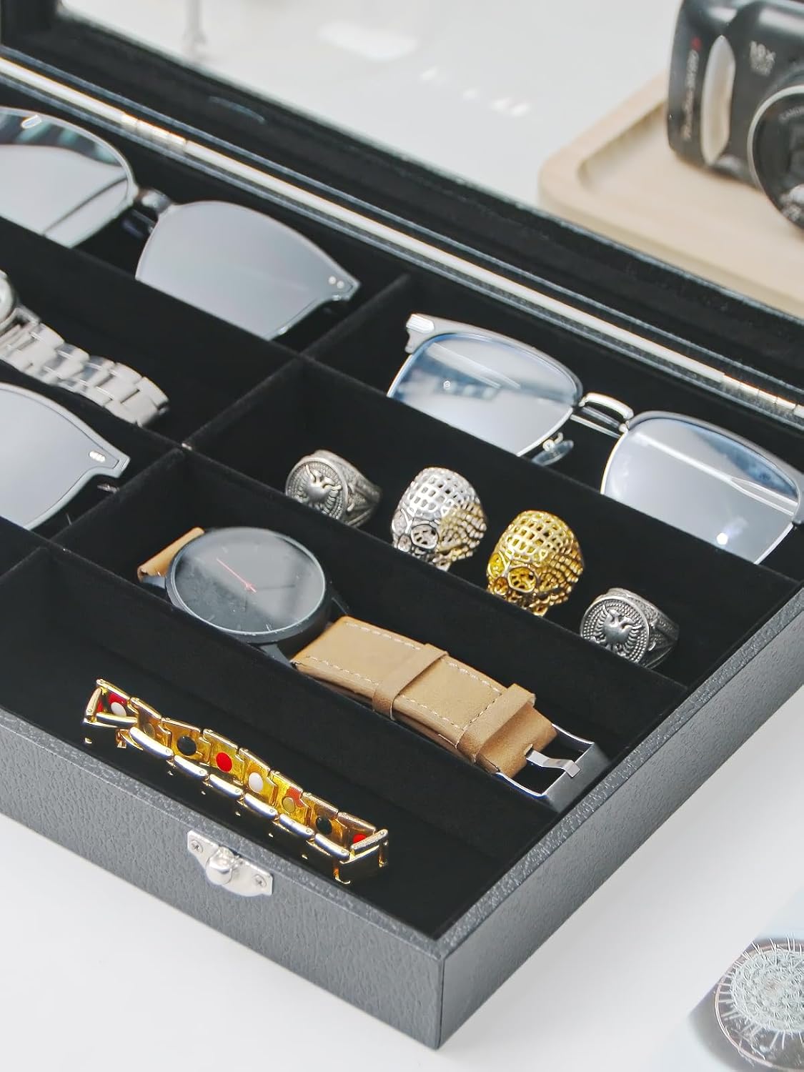 Big size tray with transparent glass lid, 13.8″x9.6″x1.6″.Can holder 8pcs suglasses.