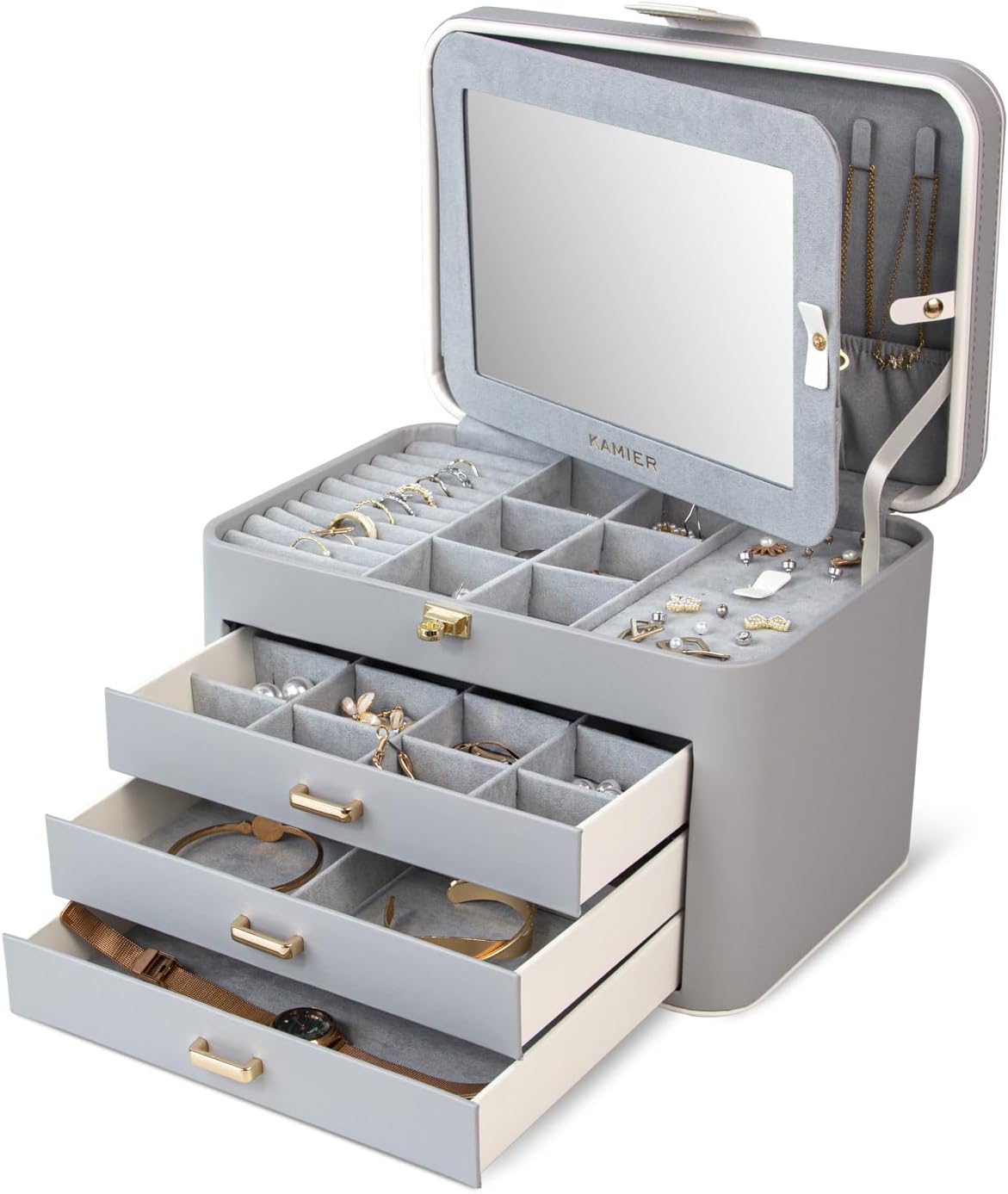 4-Layer Jewelry Storage Box: KAMIER jewelry box has 3 convenient drawers, and the top layer is equipped with a built-in mirror, behind which are hidden necklace hooks. Each layer has a dedicated area to store your precious jewelry, ensuring easy access and perfect storage. From earrings, rings, studs to necklaces, bracelets, watches, and even lipsticks, sunglasses, and perfumes, every precious item can find its own exclusive place in this exquisite jewelry organizer