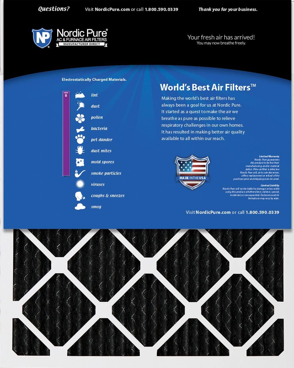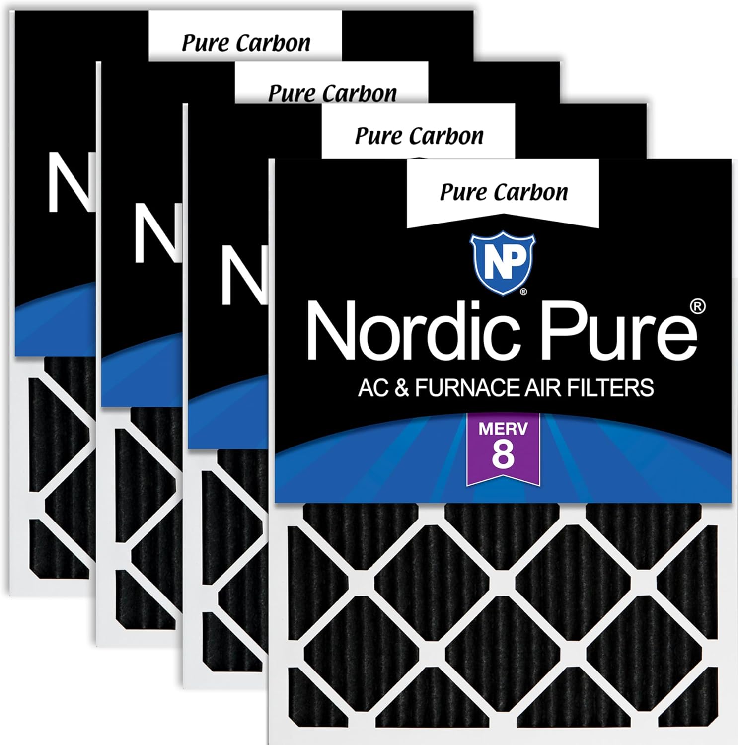 Pure Carbon Pleated Odor Reduction Air Filters by Nordic Pure is made with a durable non-woven polyester base media infused with naturally derived charcoal, created to eliminate odors in your office or home. Our pleated design provides three times as much carbon media per A/C filter but maintains excellent air flow. Our Pure Carbon air filters are manufactured using a heavy duty, moisture resistant beverage board frame. There is a metal mesh support grid bonded to the pleats for extra support. These activated carbon, odor eliminator Pure Carbon AC furnace filters can be used in residents as a stand-alone filter. They can also be used as a pre-filter in high-efficiency commercial HVAC units. They remove levels of Volatile Organic Compounds (VOCs) such as chemicals from household cleaning products. It is important to regularly change your AC air filters especially during any home improvements for fresh, clean air in your home or office. For maximum odor control, we recommend that you replace your air conditioning filter every 30-90 days. Important Note: Almost ALL furnace filters have a different “actual size” than the nominal size printed on the air condition filter. It’s best if you measure your air filter for the EXACT size and compare it to our Actual Size – and then you can be sure your A/C air filter fits!