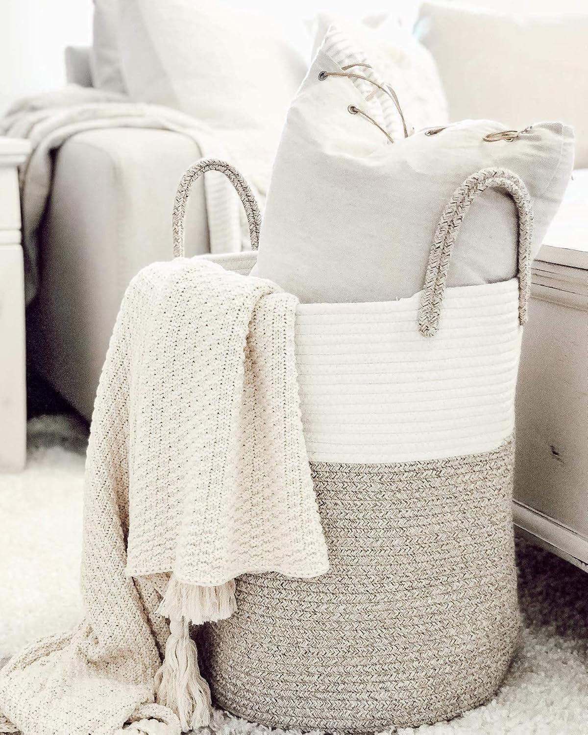 Beautiful Addition to Your Boho Decor: Elevate your living room decor with this handwoven blanket basket. Neutral tones and minimalist design create a cozy, stylish vibe, perfect for farmhouse, Scandinavian, or boho decor aesthetics.