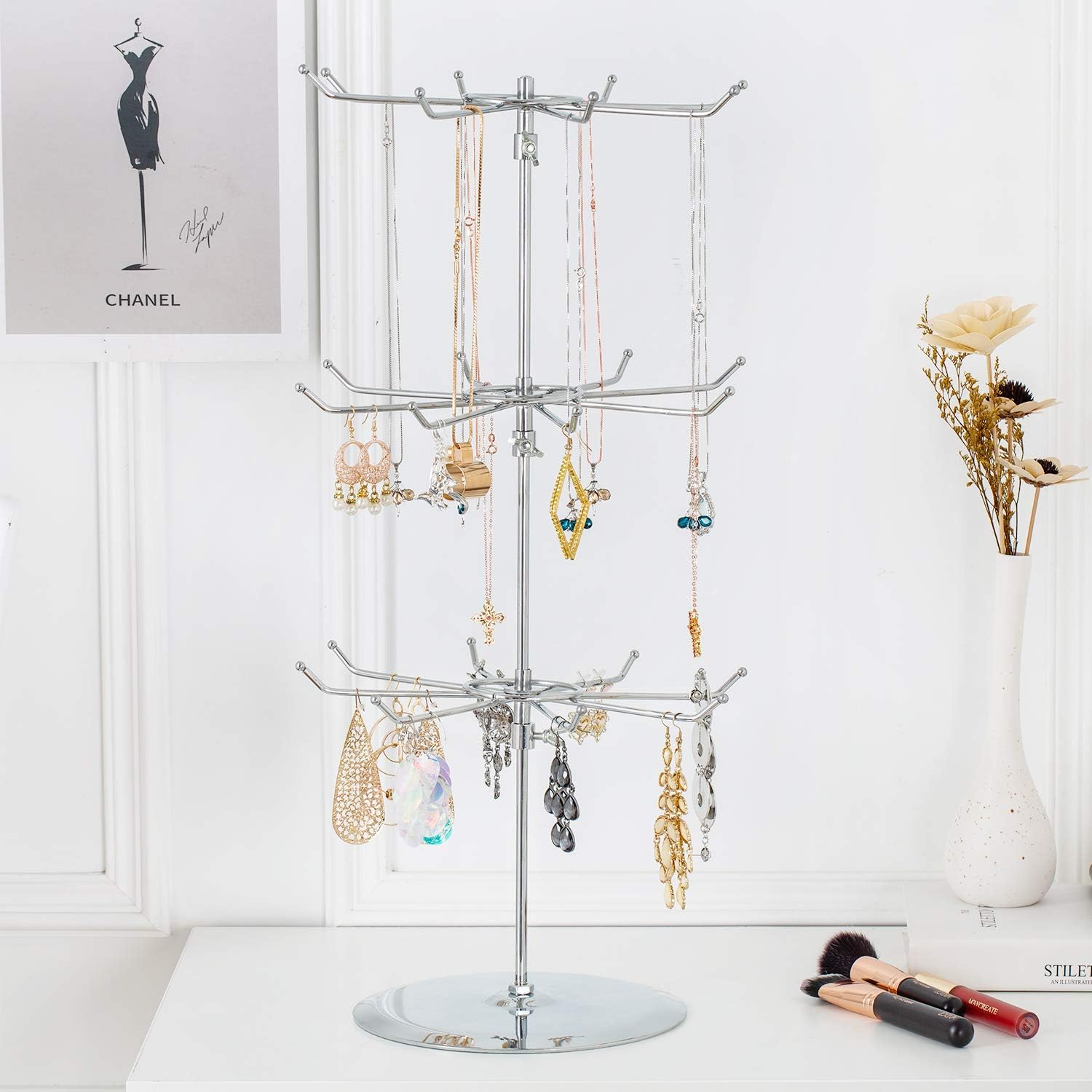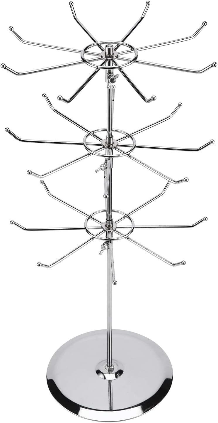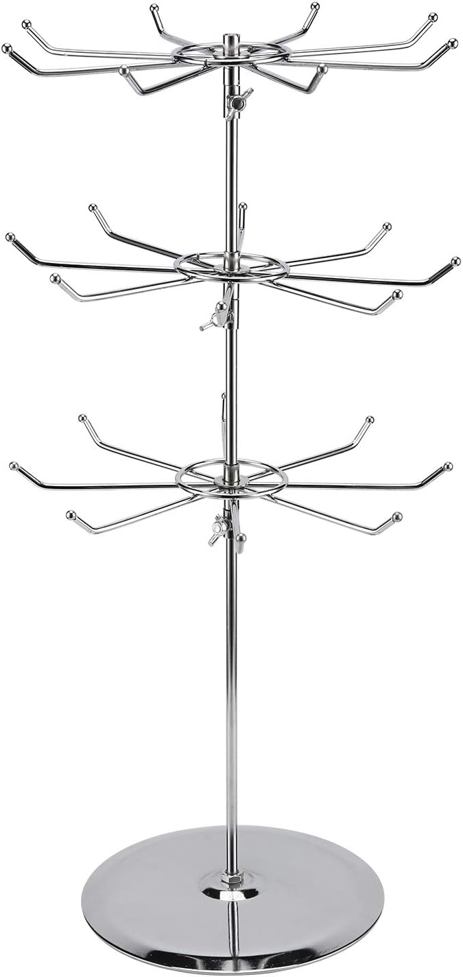 【3-Tier Spinning Design】 Effortlessly showcase your products with 360° rotating tiers, Equipped with 24 hooks threes 8-hook rotating shelves Fully display product details, especially suitable for jewelry, cosmetics, snacks and small crafts.