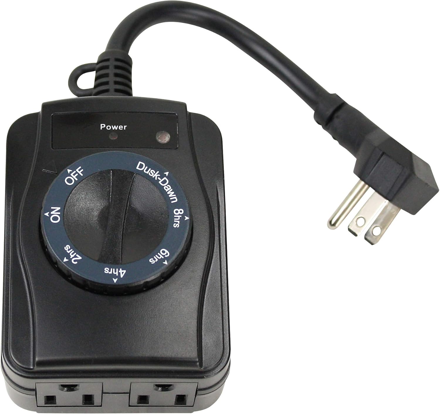 This Outdoor Timer features Interruption-Free Programming and prevents Headlights, Porch Lights and Street Lamps from interfering with the unit. The unique positioning of the outlets accepts most low-profile, right-angle and transformer plugs. The Photocell Activated components will activate the programming or reset only after the programming cycle has completed. Multiple timer options include 2hr., 4hr., 6hr., 8hr., Dusk-to-Dawn, or Always On settings.