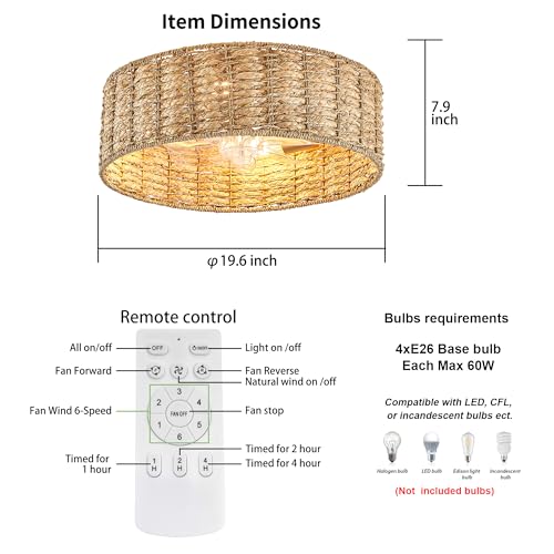 Specification: 0138-4H Handwoven Rattan Caged Boho Ceiling Fans with Lights Remote Control Flush Mount Fandelier Low Profile for Bedroom,4-Light,20″