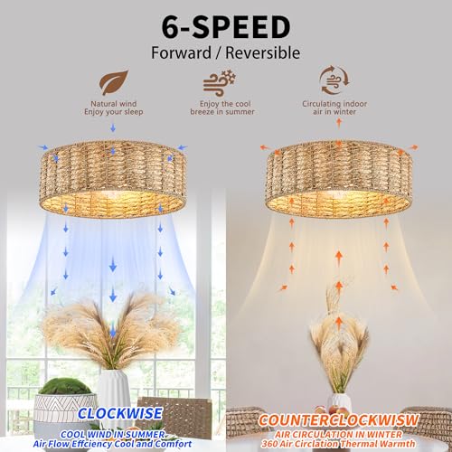 0138-4H Handwoven Rattan Caged Boho Ceiling Fans with Lights Remote Control Flush Mount Fandelier Low Profile for Bedroom,4-Light,20″