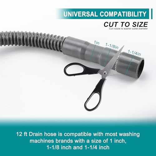 UNIVERSAL SIZE — 12 ft washing machine drain hose is compatible with most washing machines brands. Formed outlet end fits 1-Inch, 1-1/8-Inch, and 1-1/4-Inch stub outs on automatic washing machines. Simply cut hose at indents for proper fit.Easy-to-attach steel clamp included to secure hose firmly for leak-free use.Please measure your washing machine outlet..Must be 1″, 1-1/8″ or 1-1/4″ outlet