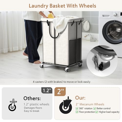 【Laundry Hamper with Wheels】Unlike other laundry baskets with standard wheels, our hamper features 2-inch diameter 360° mecanum wheels that glide easily on hardwood floors, tiles, or carpets. Two of the wheels are equipped with brakes, allowing you to easily move and secure the laundry hamper to prevent it from rolling around when not in use.