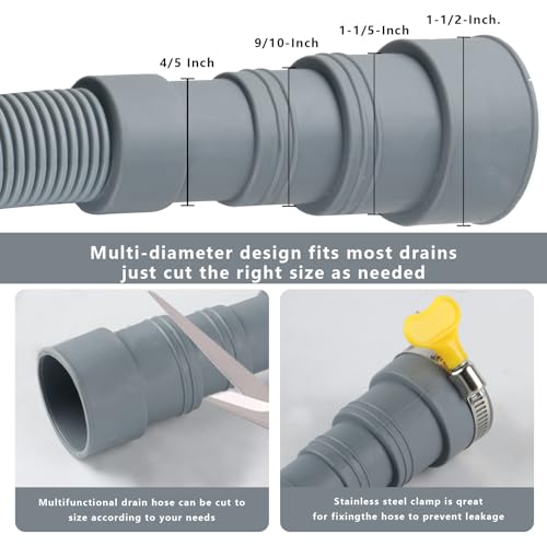 4 Connections:The dishwasher drain hose is designed with 4 connections: 4/5″, 9/10″, 1-1/5″, 1-1/2″, multi-diameter design fits most drain pipes, just Cut to appropriate size as needed. Special corrugated design prevents kinking or leaking. It’ll return to its original shape after being compressed, ensuring smooth drainage.