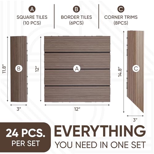24PCS Interlocking Deck Tiles Outdoor – Weatherproof Heavy Duty Composite Deck Tiles with Borders & Corner Trims Patio Floor Tiles – DIY Patio Kit, Outside Flooring for Yard Basement Balcony Poolside