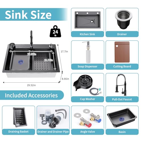 Specification: 29.5 x 18 inch Kitchen Sink, Single Bowl Stainless Steel Sink Multifunctional Drop In Sink with Pull-Down Faucet and Multiple Accessories (Black Grey, 29.5 * 18)