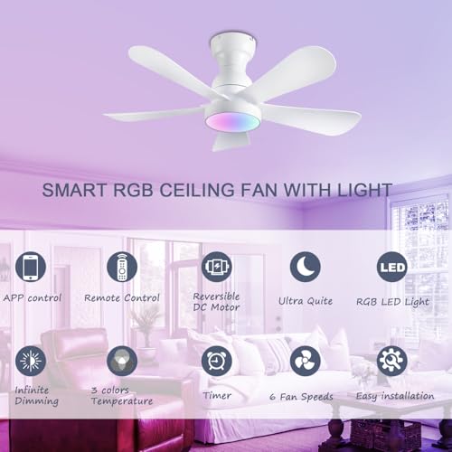Specification: 36inch Ceiling Fans with Lights and Remote/App Control, Flush Mount Ceiling Fan With Reversible Dc Motor RGB Dimmable Light, Noiseless White Modern Small Ceiling Fan For Bedroom Indoor/Outdoor