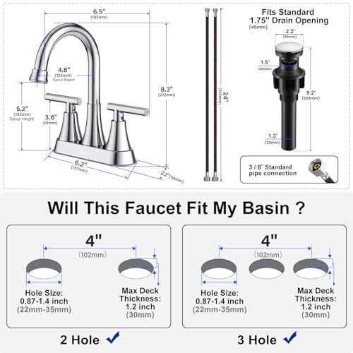 EASY INSTALLATION IN 15 MINS: 4 inch centerset american standard design bathroom faucets for sink 3 hole or counters, you’ll be able to install this bathroom sink faucet in 4 steps-15 mins with confidence. Eliminates the need for plumber, saving your both money and time. Mounting Hole Diameter:7/8-1 3/8 inch. Max. Deck Thickness:1.2 inch.