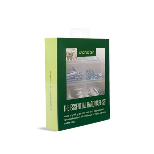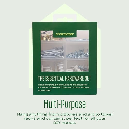 Specification: Character The Essential Hardware Set, Assorted Nails, Screws, Drywall Anchors, and Picture Hanging Hooks with Storage Box, 115 pieces