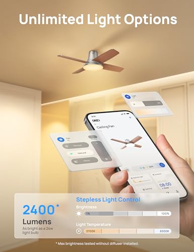 More than one Light Options: The brand new ceiling fan with lights offers infinitely adjustable brightness and color temperature, producing as much as 2400 lumens with light tones that range from 2700K warm white to 6500K cool white.