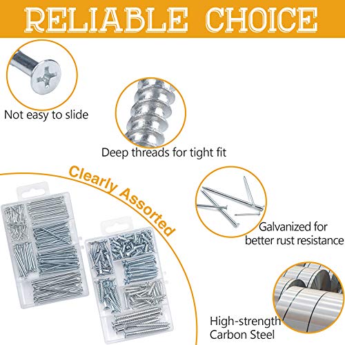 PREMIUM QUALITY FOR BETTER PERFORMANCE – All the accessories in this selected galvanized wood screws and nails set are plated with thick zinc rust proof coating, keeping you away from worries about your hardware getting corroded or rusted. The nails and screws are made of high-quality carbon steel, which is robust and will not easily bend or slide even as using.