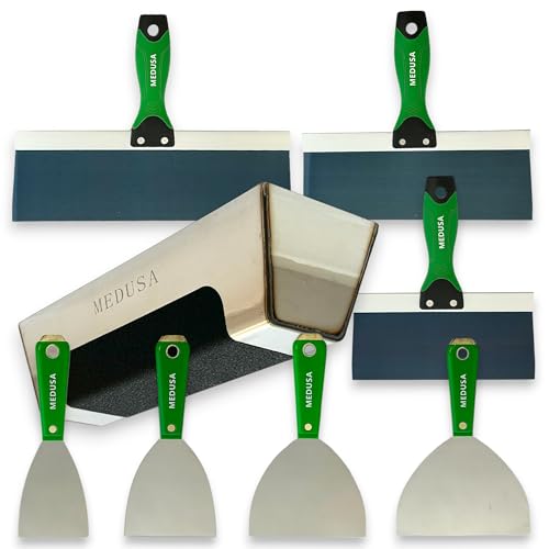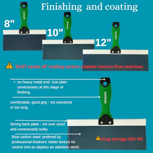 The MEDUSA CARBON and BLUE steel kit are for professionals and DIYers alike. This set includes all the right size knives you are going to need from start to finish. There is an art to finishing and our bundle includes what you wish to have to properly complete the job like a Pro with the perfect amount of strength, flexibility and Texture of Carbon Steel. The Medusa Drywall Hand Taping Tool Set has everything you wish to have to tackle whatever drywall taping project you have and this kit is made of top quality profession grade materials so its designed to last. Also includes an easy clean professional grade stainless mud pan 0.7mm thick with a comfortable non slip grip which is a will have to for most, especially with wet, sweaty, dirty or cold hands. Carbon and Blue steel are the most popular Blade of a professional finisher as they are going to last longer than S.S when you take care of them properly. Stainless is way more likely to fail from a drop,nick,or bend. Carbon is easily repaired with sand paper.