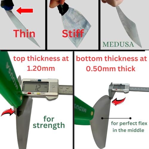 Classic Style handles which most pro’s prefer as they are lighter, fit your hand better, and don’t seem to be as long as others. The blades are 1.20mm and taper off to 0.5mm giving you the flex you want, where you wish to have it also has metal Hammer Head to tap in Reasonably protruding objects, screws and imperfections