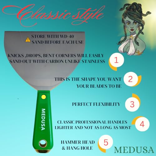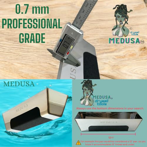 Specification: Medusa’s Carbon and Blue Steel Drywall Taping Knife set with Stainless Steel 12″ Mud Pan And Grip: Classic Style Light Handles with Strong Flexible Blades for Professionals and Beginners