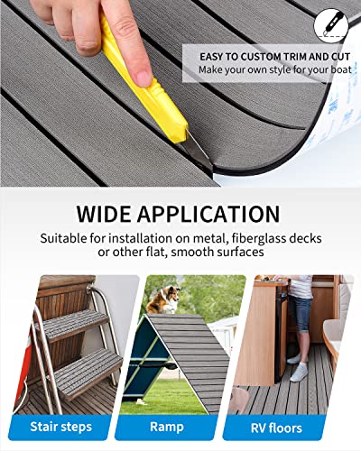 6 mm Thick High Quality Closed Cell Eva Foam: Premium soft boat decking material provides great heat resistance, water resistance and level 3 UV stability for durability; eva foam gives you a shock-absorbing cushioned feel under foot; protects boat surface from scratches, reduces noise; it is recommended for installation on metal or fiberglass decks or other flat, smooth surfaces