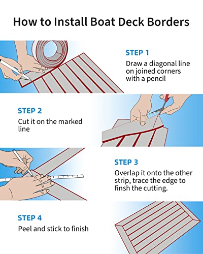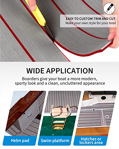 Specification: OCEANBROAD Self-Adhesive 96”x2.4” Boat Flooring with 3M Adhesive Backing EVA Foam Faux Teak Marine Boat Decking Non-Slip Sheet for Jon Motor Boats Yacht Helm Pad Floor, Gray with Red Seam Lines