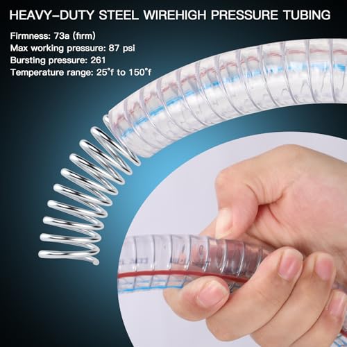 Heavy-Duty and Flexible Oil Drain Hose: Made from high-quality transparent PVC, this oil drain hose offers excellent resistance to high temperatures, oil corrosion, and acid-alkali damage. Its thickened design enhances scratch resistance, The hose maintains outstanding flexibility in cold weather without hardening or cracking. Reinforced with internal steel wire, its specialized structure provides superior pressure tolerance, delivering exceptional reliability and strength under high-pressure use. Ideal for demanding applications, this hose ensures long-lasting performance and dependable operation