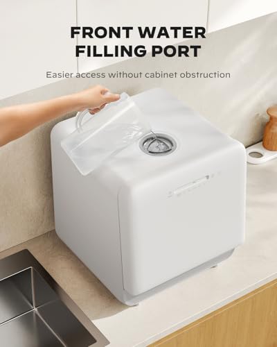 Compact Size, Large Capacity: The compact dishwasher measures 16.9 x 17.3 x 18.1 inches to fit conveniently in any kitchen. The countertop dishwasher can hold up to 4 full place settings (54 pieces of tableware) and plate sizes up to 10 inches. Ideal for families of 3-4 and perfect for apartments, dorms, and RVs.