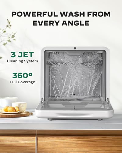 3 Jet Cleaning System: Enjoy superior cleaning thanks to an advanced 3-jet cleaning system that provides full 360° coverage. This technology features powerful water jets that clean dishes from every angle to effectively remove tough stains and residue. Simply push a button on the portable dishwasher and experience sparkling clean dishes after every cycle.