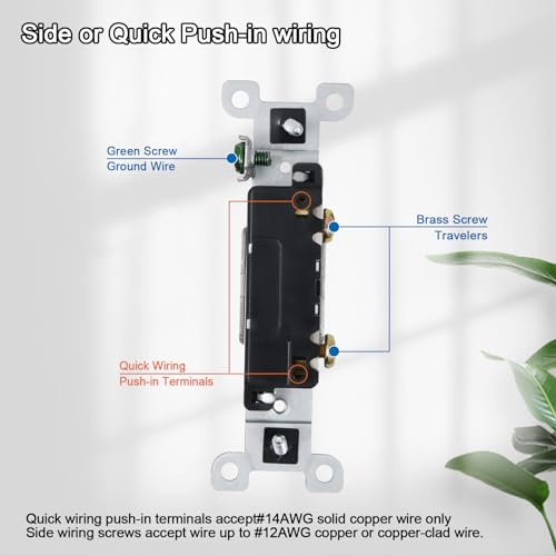 【Quick Push-in Wiring】 Provide both quick push-in wiring and side wiring. Quick wiring push-in terminals easily accept #14AWG solid copper wire only. Side wiring terminal screws accept wire as much as #12AWG copper or copper-clad wire.