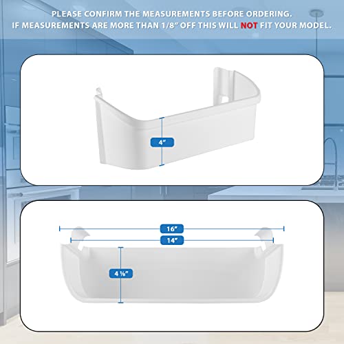 ✅【 SIZE 】 Maximum Length: 16″, Bottom Width: 4-1/8″, Depth: 4-1/4″. Please see product images for more details. If your bin is less than 15-3/4″ wide, you’re going to need 240363701 instead and this Frigidaire refrigerator door shelf will NOT fit.