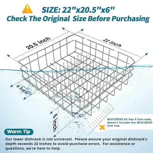 Specification: Upgraded W10728159 OEM Dishwasher Lower Rack Fit for Kitchenaid Dishwasher Rack, W10525646 W10780925 Dishwasher Rack Lower Intended for Maytag Dishwasher Parts Deep 22in Wide 20.5in 3-Year Service
