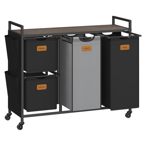 Specification: VASAGLE Laundry Hamper with 4 Compartments, 39.6 Gal. (150 L) Laundry Sorter, Rolling Laundry Cart with Shelves, Small Side Pockets, 6 Labels, Chestnut Brown, Ink Black and Dove Gray UBLH203B01