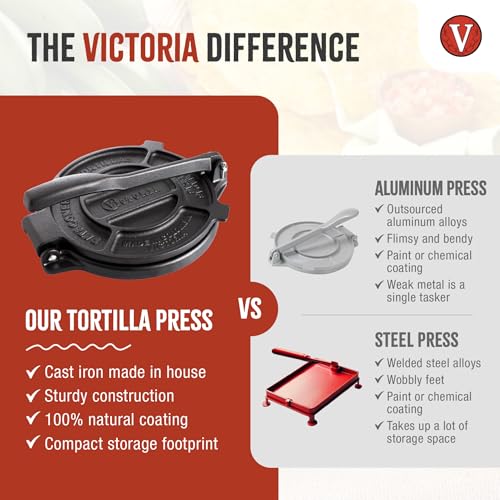 Give your cooking and tortillas the upgrade they deserve with high-quality cast-iron cookware. Cast-iron cookware is superior to traditional cookware because it offers better heat retention and durability and outlasts more conventional tortilla presses. The Victoria Cast-Iron Tortilla Press is commercial-grade and built from high-quality cast iron with the cook in mind. It features a reinforced design with engineered plates that avoid pinching and a reinforced base for better resistance.