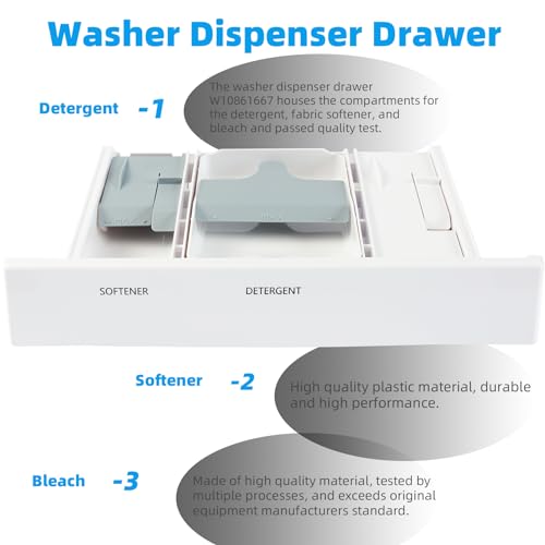 【Upgraded】This dispenser drawer (part number W10861667) is for washers, the Washing machine dispenser drawer W10861667 houses the compartments for the detergent, fabric softener, and ble-ach. The Washing machine dispenser drawer replacement part is high standards, exceeds original equipment manufacturers with prime quality standard. You’ll be able to buy with confidence.