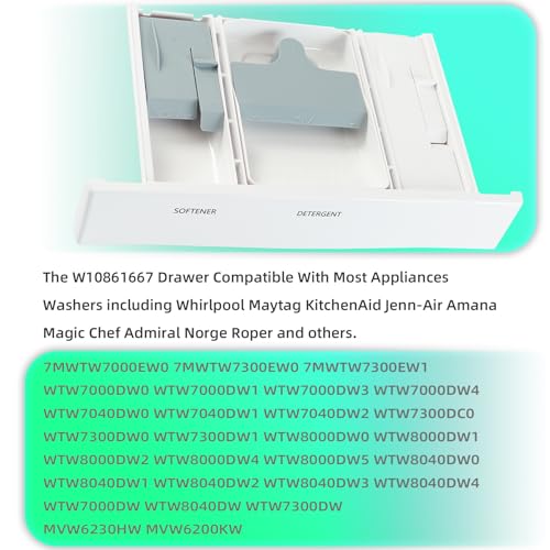 【Fit】The W10861667 Drawer Compatible With Most Appliances Washers including Whirlpool Maytag Kitchen-Aid Jenn-Air Ama-na Magic Chef Admiral Nor-ge Ro-per and others. Fit for 7MWTW7000EW0 7MWTW7300EW0 7MWTW7300EW1 WTW7000DW0 WTW7000DW1 WTW7000DW3 WTW7000DW4 WTW7040DW0 WTW7040DW1 WTW7040DW2 WTW7300DC0 WTW7300DW0 WTW7300DW1 WTW8000DW0 WTW8000DW1 WTW8000DW2 WTW8000DW4 WTW8000DW5 WTW8040DW0 WTW8040DW1 WTW8040DW2 WTW8040DW3 WTW8040DW4 WTW7000DW WTW8040DW WTW7300DW MVW6230HW MVW6200KW.