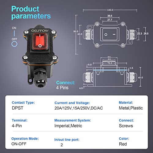 Specification: Waterproof On Off Toggle Switch Double Outlet with Red Light Rocker Button Inline Cord Switch DPST AC/DC 20A-125V,16A-250V,30A-24V,35A-12V, IP66