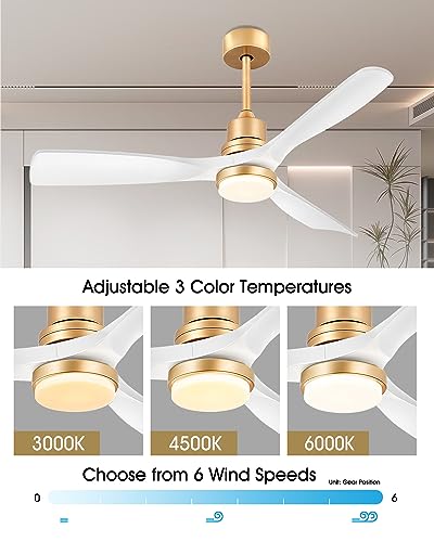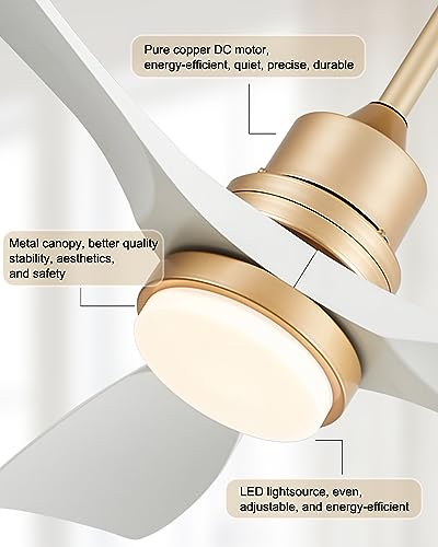 Specification: White and Gold Ceiling Fans with Lights Remote Control, 52 inch Modern Gold Ceiling Fan ETL Listed, 3 Downrods, 3 blades Gold Fan Reversible Quiet DC Motor, Timer, 6-Speed for Outdor Patio Bedroom