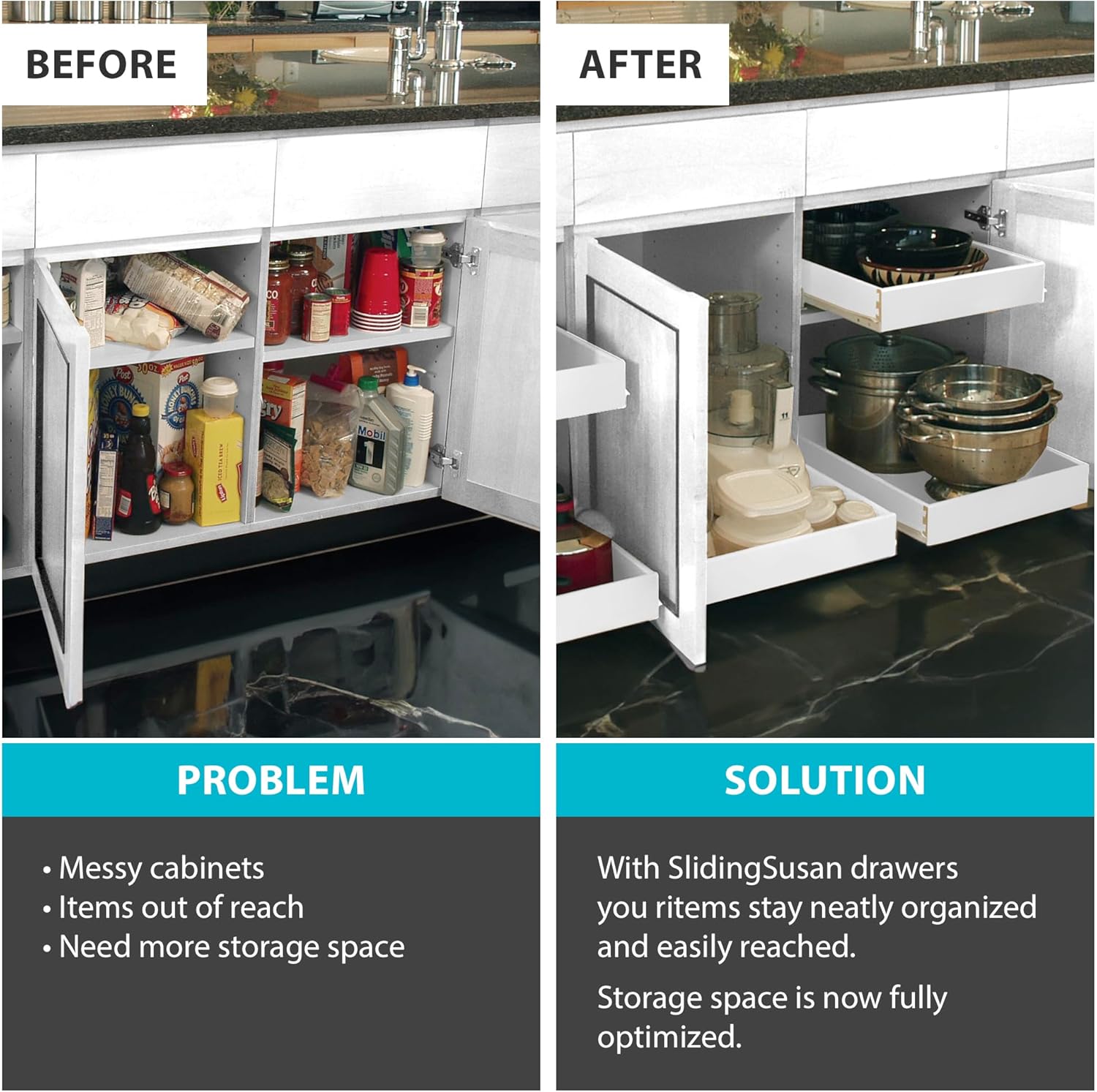 ORGANIZATION MADE EASY: Clear out cluttered cabinets and inaccessible storage areas with SlidingSusan’s soft-close, full-extension roll out drawers, the ready-to-use DIY solution for your kitchen, pantry, garage, bathroom, or any cabinet in your home